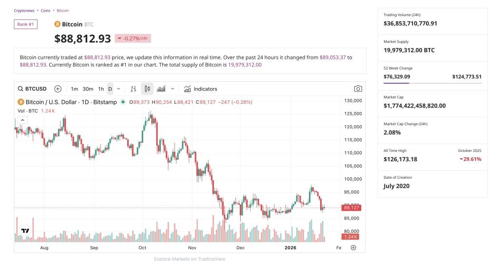 Bitcoin is trading around $88,800 on Thursday, down roughly 0.3% over the past 24 hours, according to CryptoNews data. The asset has retreated from recent highs above $95,000 and remains well below its October 2025 all-time high near $126,000.