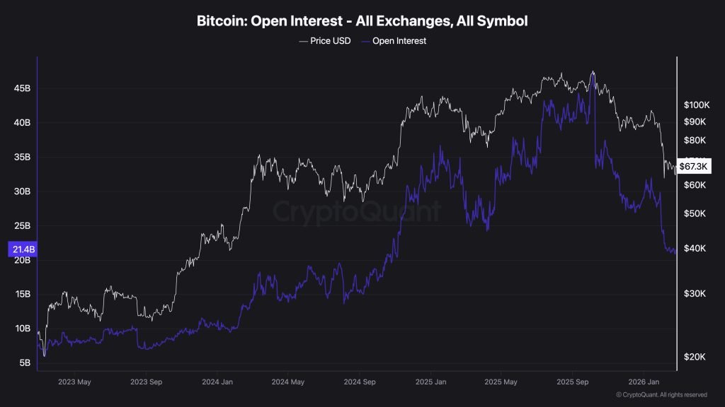Open interest has fallen sharply, signaling broad deleveraging rather than aggressive new long exposure.