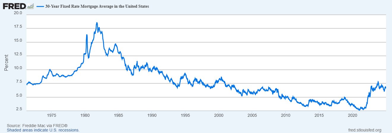 Consider this St. Louis Fed chart tracking Freddie Mac data on the 30-year, fixed-rate mortgage average. In the 1990s, 7% rates were more or less the norm. Compared to rates in the 1970s and 80s, 7% rates look like a deal. In fact, September, October, and November of 1981 all saw mortgage interest rates above 18%.