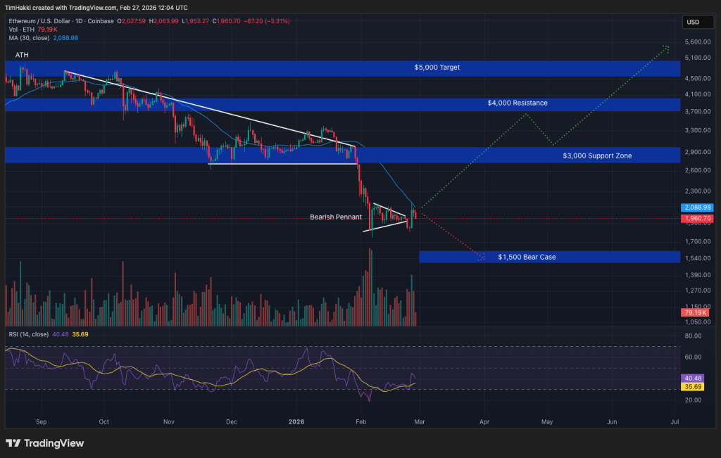 Ethereum is trading at $1,960. The price has compressed into a tight range, lagging behind the broader market rally. The $2,000 level is now the critical psychological and technical pivot that will help ETH consolidate its current ground and go up to the next leg.
