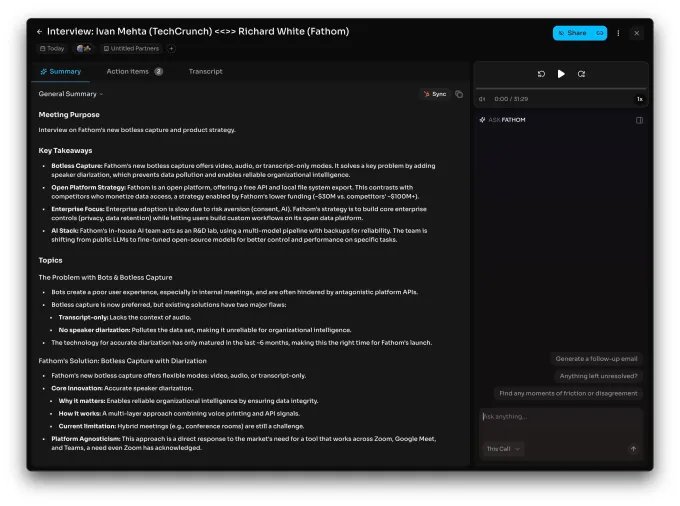 White said Fathom has always wanted to release a bot-less client for transcribing meetings, and this update was enabled by AI improvements in the last six months across various models.