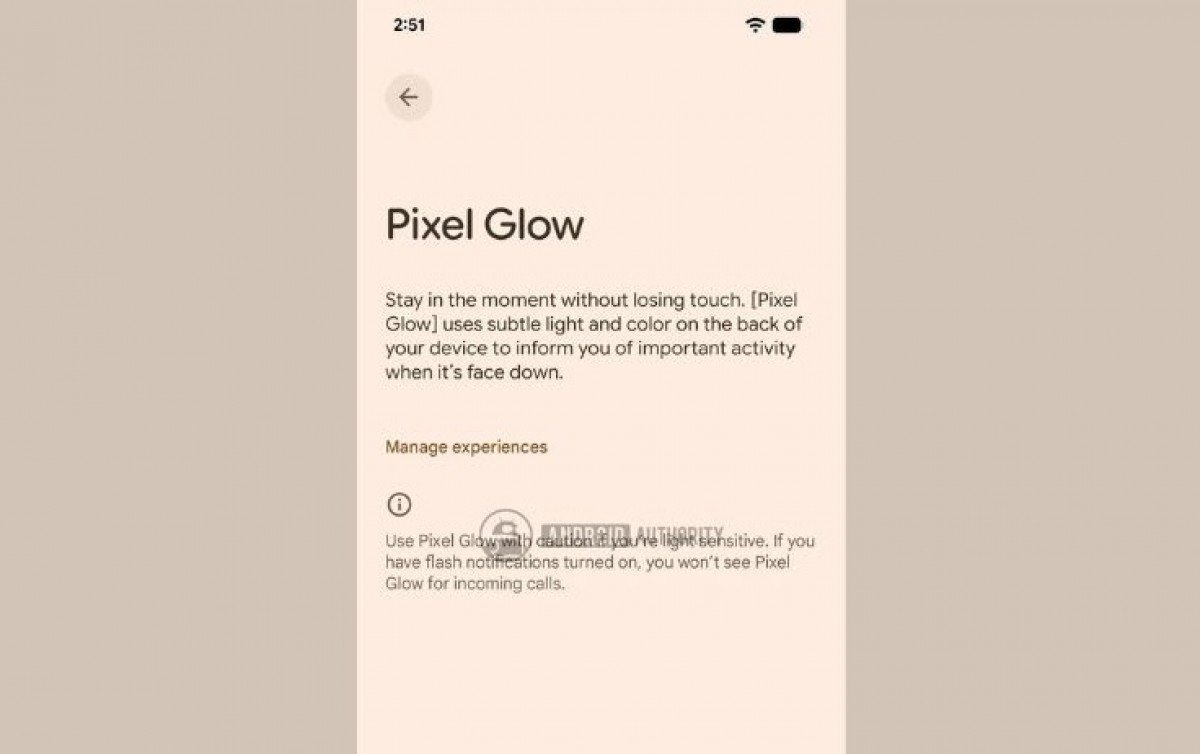 A screenshot shared in the report offers additional details, revealing that Pixel Glow will use colored lights on the rear panel to notify users of incoming alerts when the phone is placed face down.