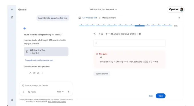 Students can prompt Gemini by typing “I want to take a practice SAT test,” and the AI will provide them with a free practice exam. Gemini then analyzes the results, highlighting strengths and identifying areas that need further review. It also offers detailed explanations for any incorrect answers.