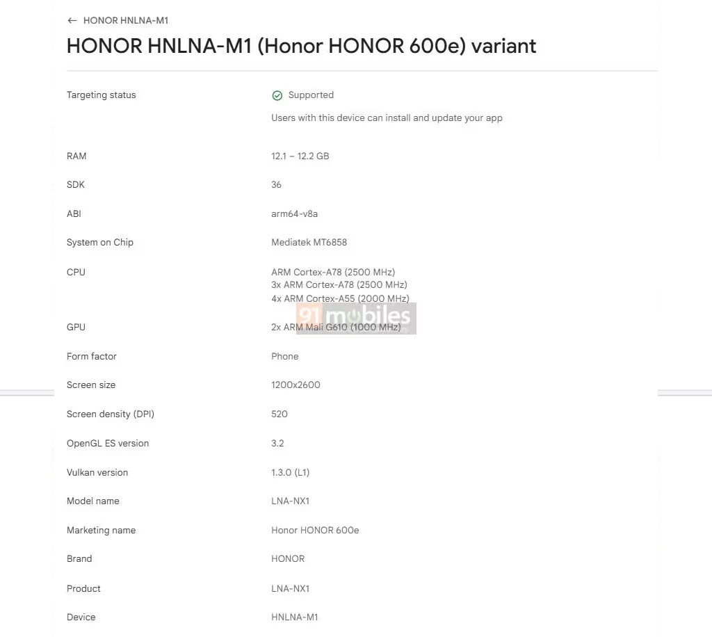 According to the latest details, the Honor 600e has been spotted on the Google Play Console database with the model number – HNLNA-NX1. It has revealed a few prime specifics of the smartphone ahead of its official release in the market.