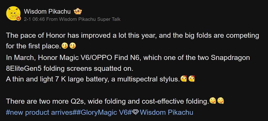 SmartPikachu on Weibo said that Honor Magic V6 and OPPO Find N6 are the top two foldable phones for the first half of this year. Both models will bring cutting-edge technologies and surprising features to compete for the leading position in the market.