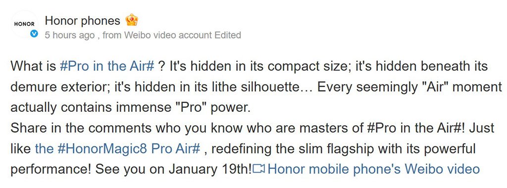 “Share in the comments who you know who are masters of #Pro in the Air#! Just like the #HonorMagic8ProAir#, redefining the slim flagship with its powerful performance! See you on January 19th!”