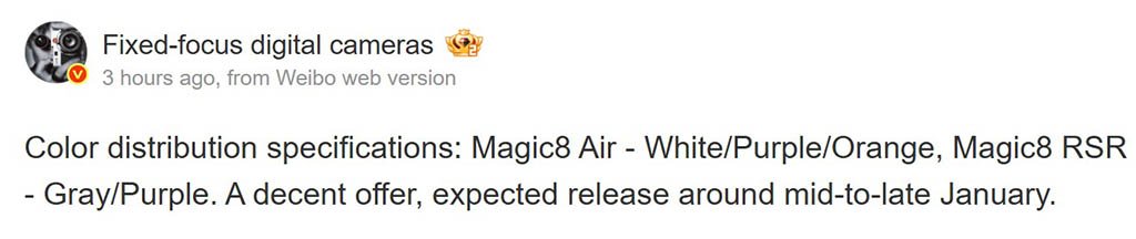 According to Weibo tipster @FixedFocus, the Honor Magic 8 Pro Air and the Magic 8 RSR will have amazing color options over the standard and the Magic 8 Pro.