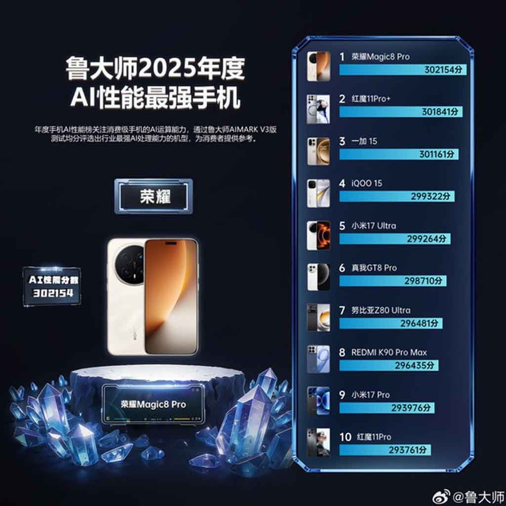 Among various competitors, the Honor Magic 8 Pro has topped the most powerful AI phone of 2025, with the highest score of 302154 points for the best performance.