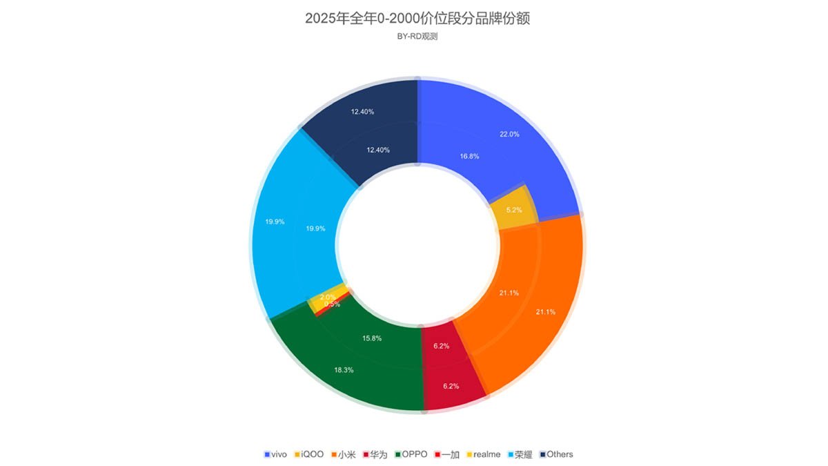 RDObservation has dropped the pie chart of the 2025 entry-level phone sales on Weibo, where the top five tech brands are Vivo, iQOO, Xiaomi, Honor, and Huawei.