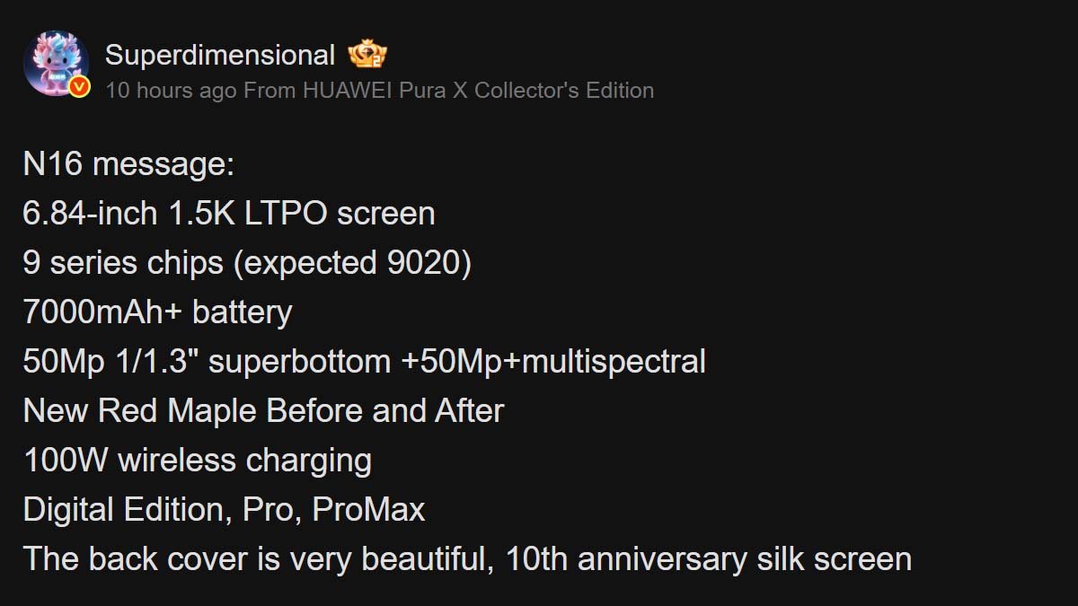 Weibo tipster SuperDimensional has shared a big list of Huawei Nova 16 specifications, revealing three variants in the series: Standard, Pro, and Pro Max.