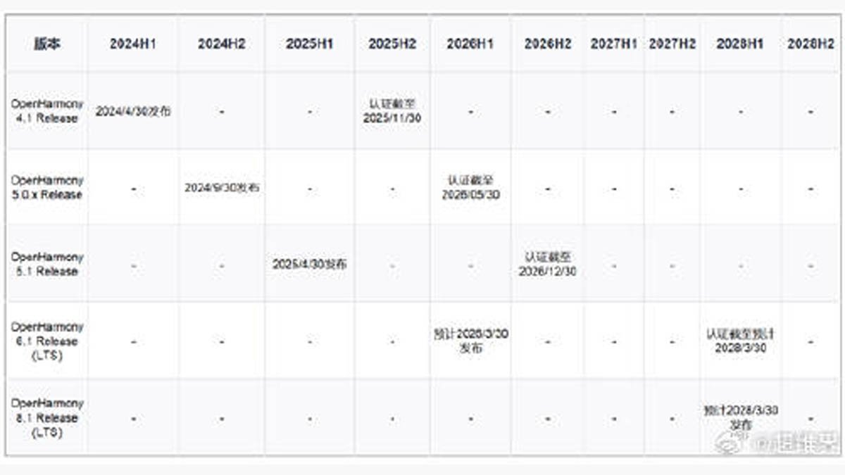 SuperDimensional has shared a screenshot, claiming it to be an official piece of information by Huawei. The page shows that the OpenHarmony 6.1 will likely be released by March 30 with a certification deadline for March 30th, 2028.