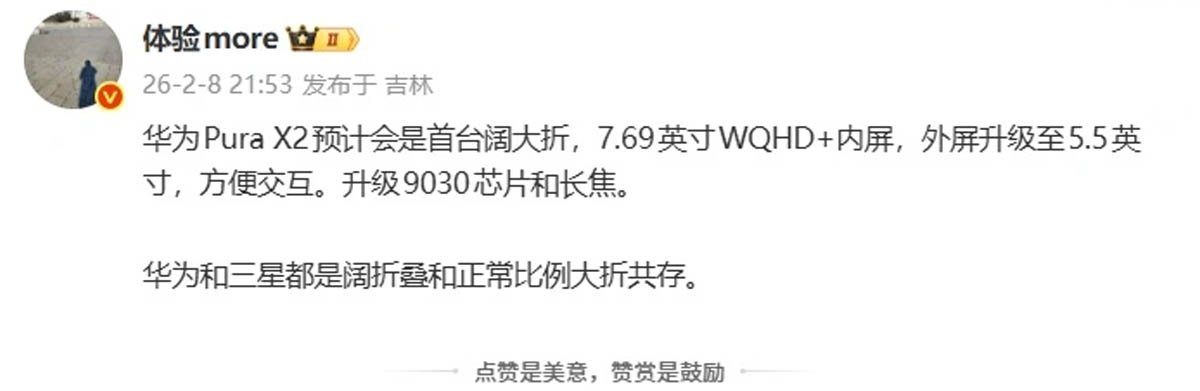 ExperienceMore tipster on Weibo revealed that the Huawei Pura X2 can feature larger screens. The company may use a 7.69-inch WQHD+ panel for the inner display, while an upgraded 5.5-inch panel for the cover part.