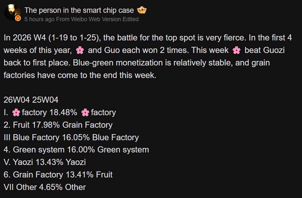 SmartChipInsider on Weibo has once again shared the analysis of the 4th week of the 2026 Chinese smartphone sales market, where Huawei is standing at the top.