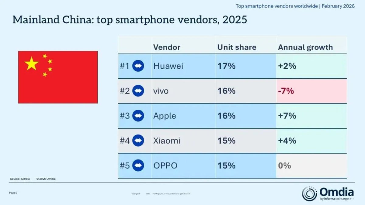 Omida has recently shared the data on the 2025 smartphone sales market in Greater China, showing the strong performance of Huawei, Apple, and other top tech vendors. While the former has appeared at the top, iPhone maker has slipped to third.