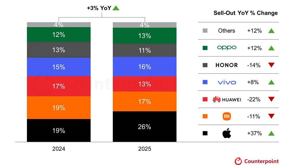 That made Apple score 37% of sales share in China. On the flip side, Huawei grabbed third spot with a 22% decline in shipments due to the Mate 80 launch preparations.