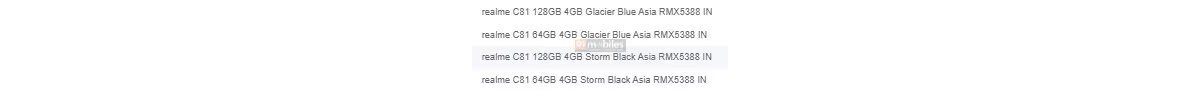 The Realme C81 will allegedly be available with 4GB of RAM and 64/128GB of storage. It has the model number RMX5388. It will be offered in Storm Black and Glacier Blue, according to the screenshot below which seems to be showing an internal retailer or carrier system somewhere.