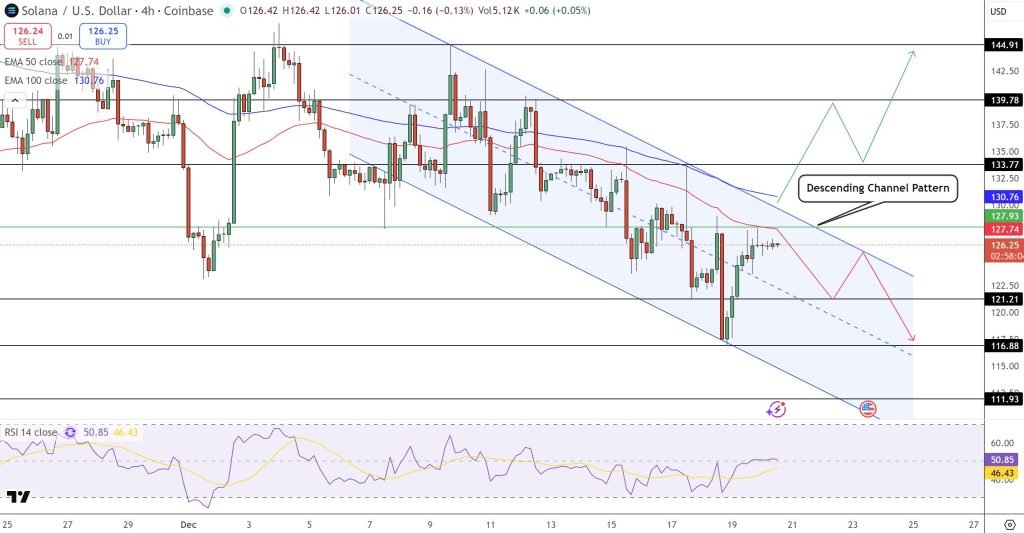 From a technical standpoint, Solana price prediction remains bearish. SOL/USD is trading inside a descending channel on the 4-hour chart after rejecting the $145 area earlier this month. Price dipped below the 50-EMA near $127.70 and the 100-EMA around $130.80, confirming short-term bearish control.