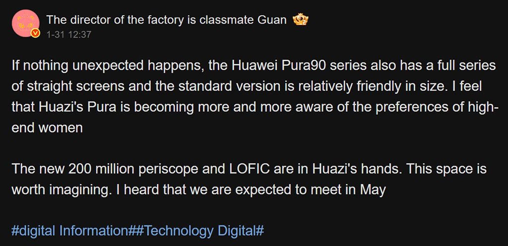 The tipster adds another notable point: the Huawei Pura 90 series will likely have more selling points aimed at female customers. For instance, the size, colors, appearance, and more. It may also bring special features for female users.