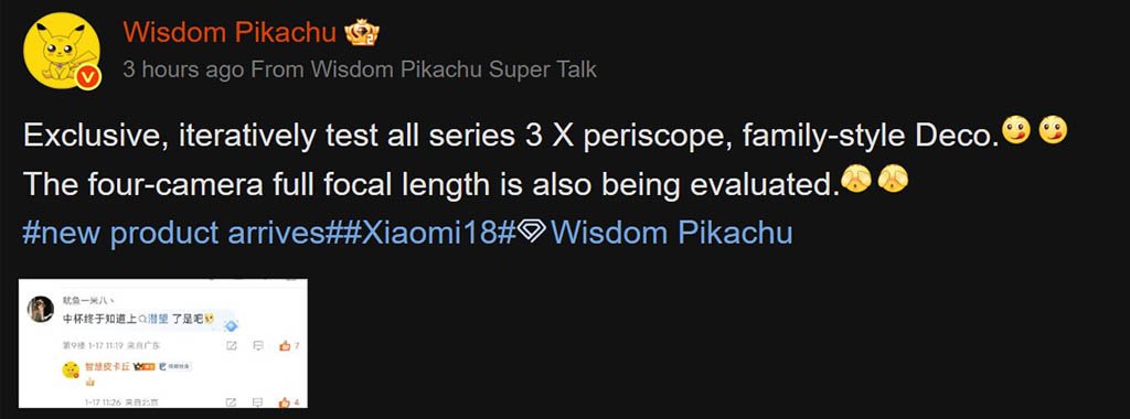 SmartPikachu noted that Xiaomi is testing a 3x periscope telephoto lens for all the models of the Xiaomi 18 series. The company is working on a quad-camera with a full focal-length for all of the variants in the coming main flagship lineup.