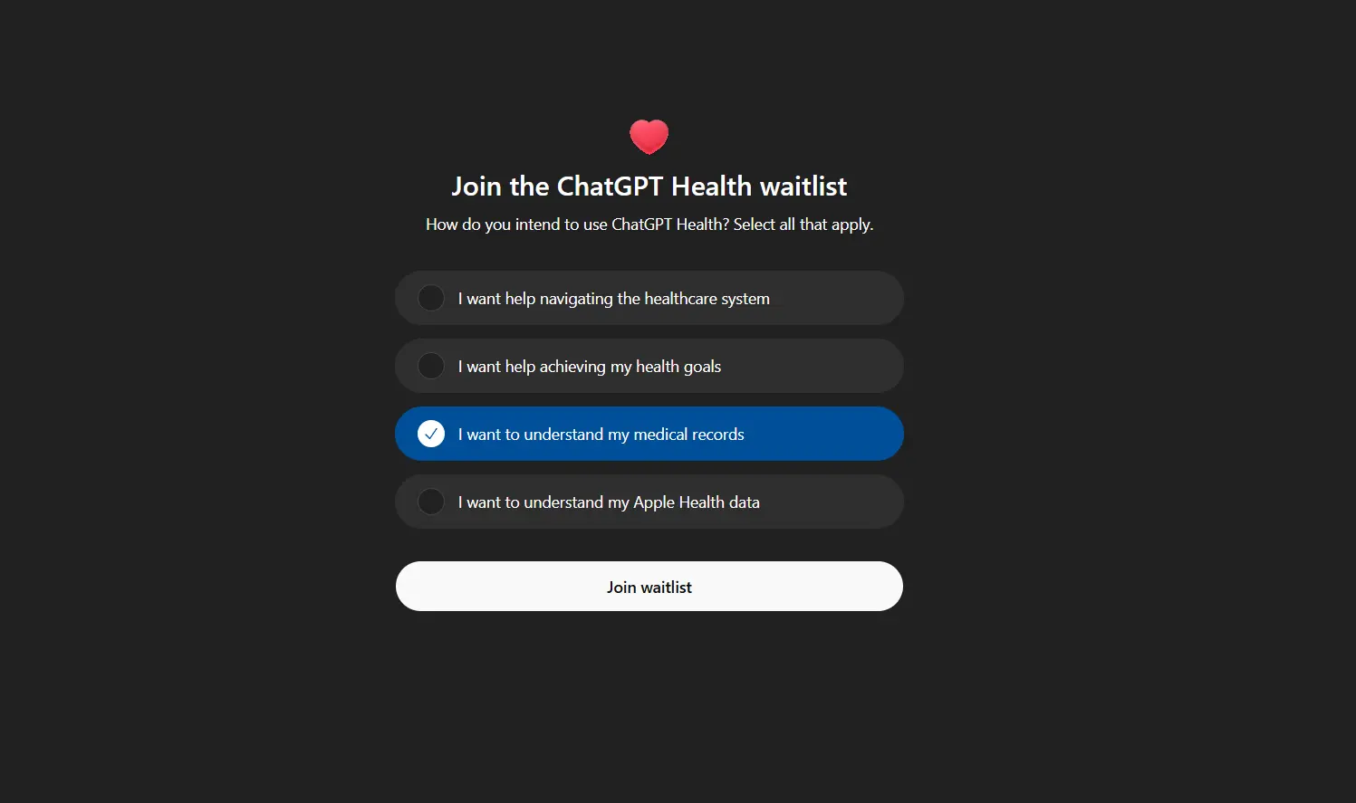 We’re rolling out ChatGPT Health to a small group of users so we can learn and improve the experience. Join the waitlist for early access.
