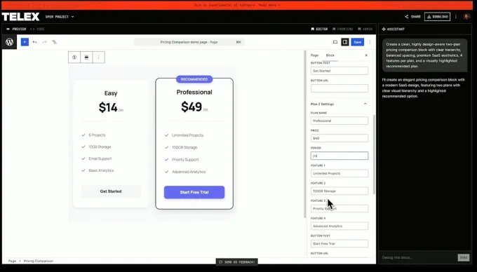 In the first example, Mullenweg showed off a pricing comparison tool built with Telex, noting that these sorts of rich, interactive web elements were something that a developer used to have to custom-build, but could now be created in a few seconds.