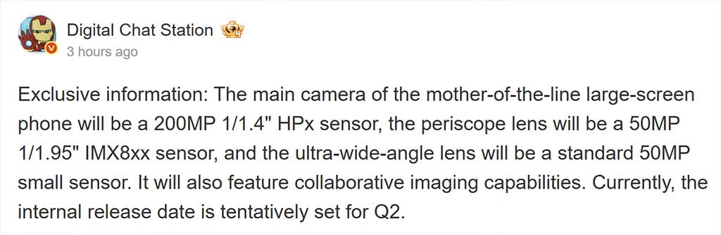 The particular leak described that a new Xiaomi phone is in the making with a 200MP 1/1.4-inch HPx main camera sensor, a 50MP 1/1.95-inch ultrawide-angle lens, and a 50MP IMX8xx sensor for the periscope part.