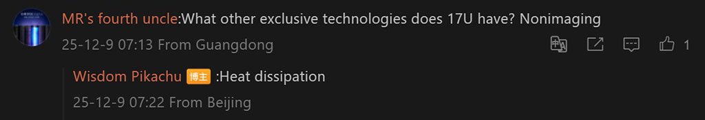 In the comments section of a SmartPikachu’s Weibo page, a netizen asked what other exclusive technologies the Xiaomi 17 Ultra has. In response, the tipster said “Heat Dissipation”.