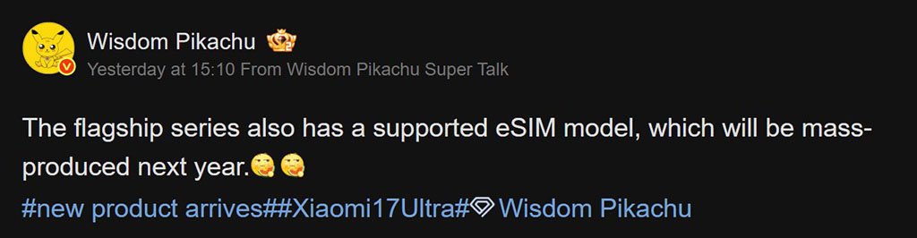 SmartPikachu noticed that Xiaomi is working on a flagship phone series with a special eSIM variant. The tipster added that this new handset will be “mass-produced” next year. Hence, the phone market may get a new rival for top-end models.