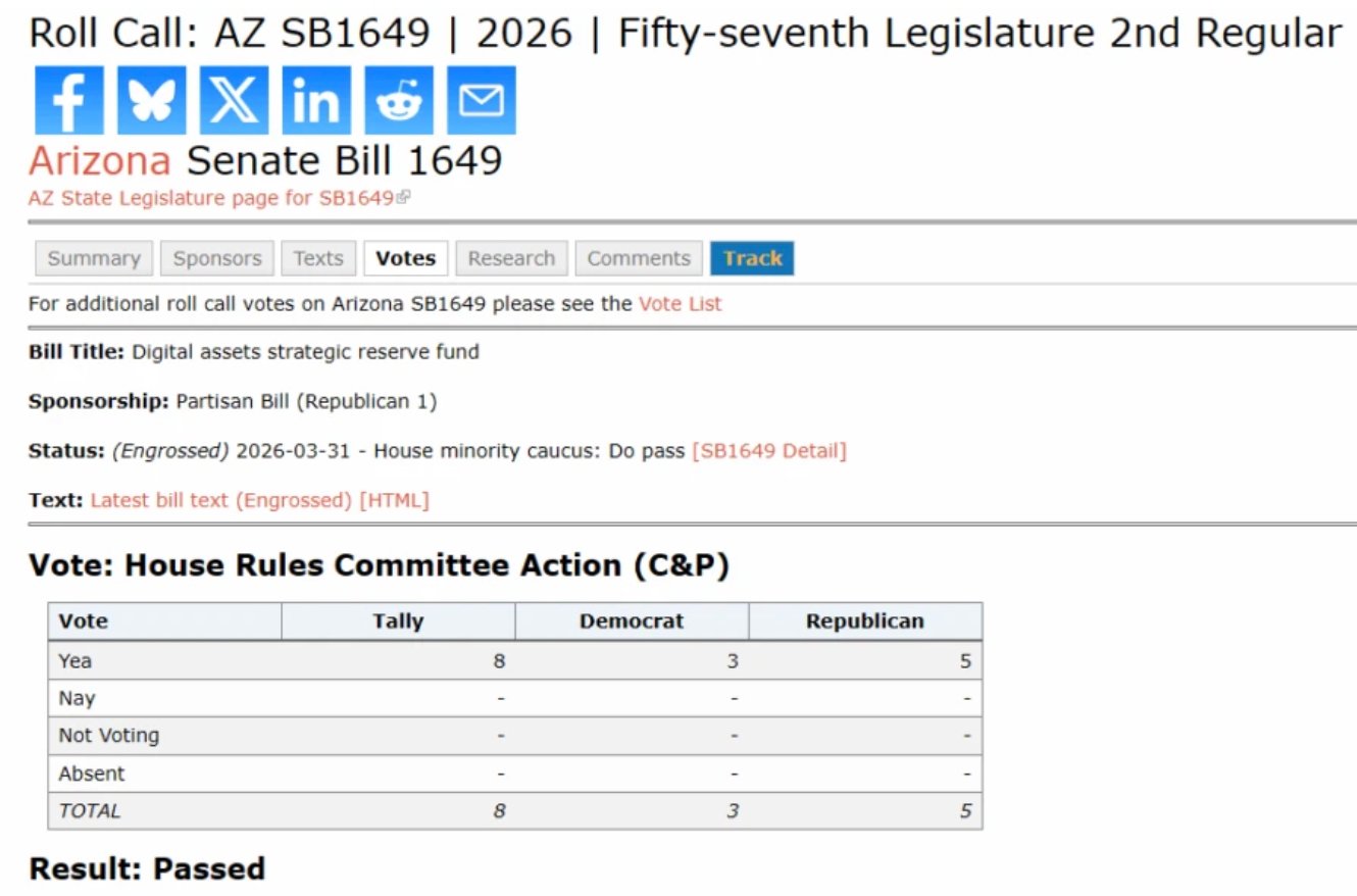 Arizona’s SB1649 would create a Digital Assets Strategic Reserve Fund, placing confiscated, surrendered, or state-held digital assets under the state treasurer’s direct control. XRP is explicitly named alongside Bitcoin, stablecoins, and a handful of altcoins.